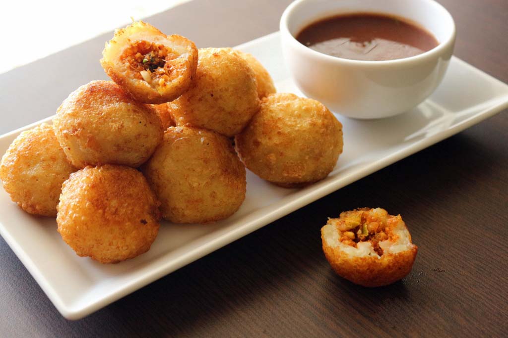 Who says a person cannot feast when fasting! Faral means "fast" and these pattice are designed specifically for those who are fasting. The coating of arrowroat adds a unique dimension to this common dish. Served with sweetened curds, to complete the mast experience!